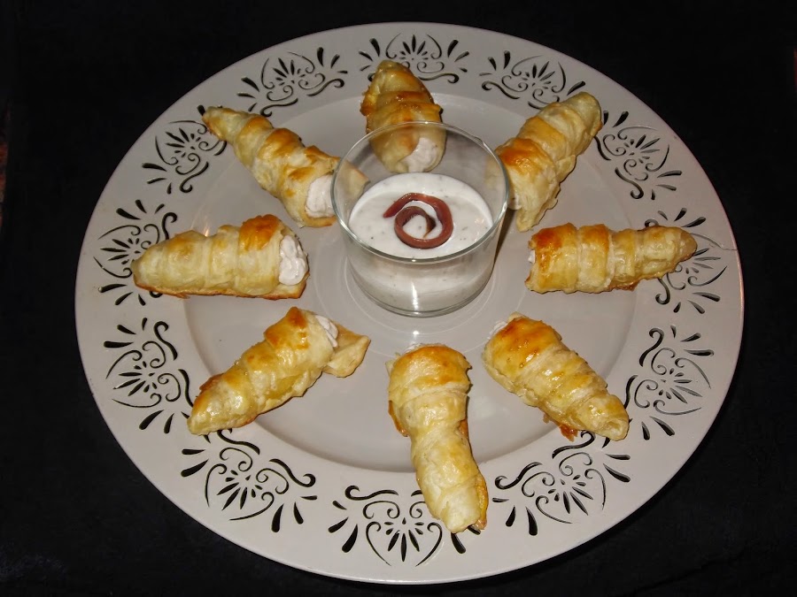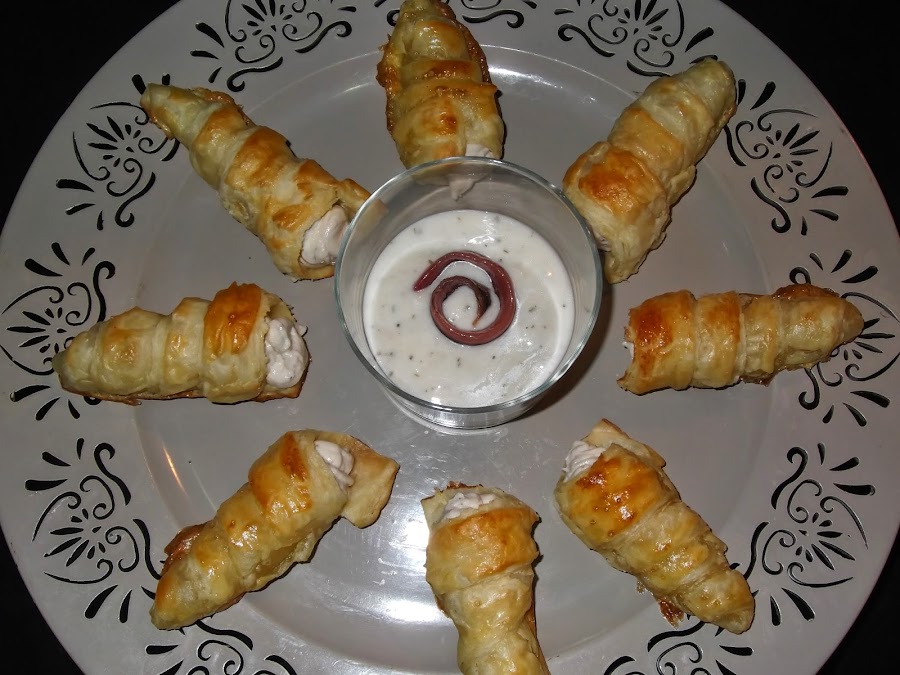 Cuando sacáis los cucuruchos del horno, los tenéis que dejar enfriar, como veréis a los moldes yo no les he untado mantequilla ni ningún otro tipo de producto porque salen muy fácilmente, pero si queréis podéis darle con un poco de mantequilla derretida. Una vez que los habéis desmoldado, metéis la crema de anchoas en una manga pastelera y los vais rellenando uno a uno. Una vez que están rellenos los mojáis en la salsa y ya están listos para comer.