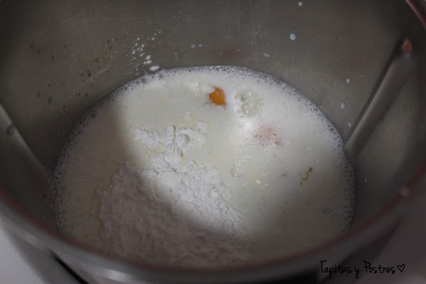 Preparamos la crema pastelera. Todos los ingredientes, menos el cacao al vaso. Cocinamos.
