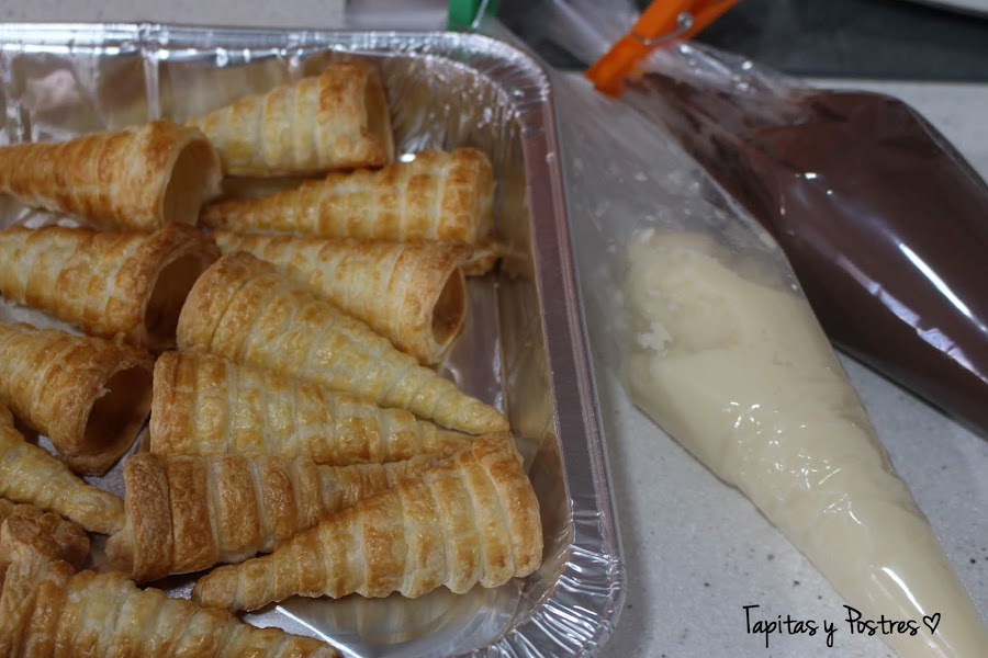 Cuando la crema pastelera esté fria, rellenamos los conos con ella. Algunos con crema de vainilla y otros con crema de cacao. Los espolvoreamos con azúcar glass antes de servir.