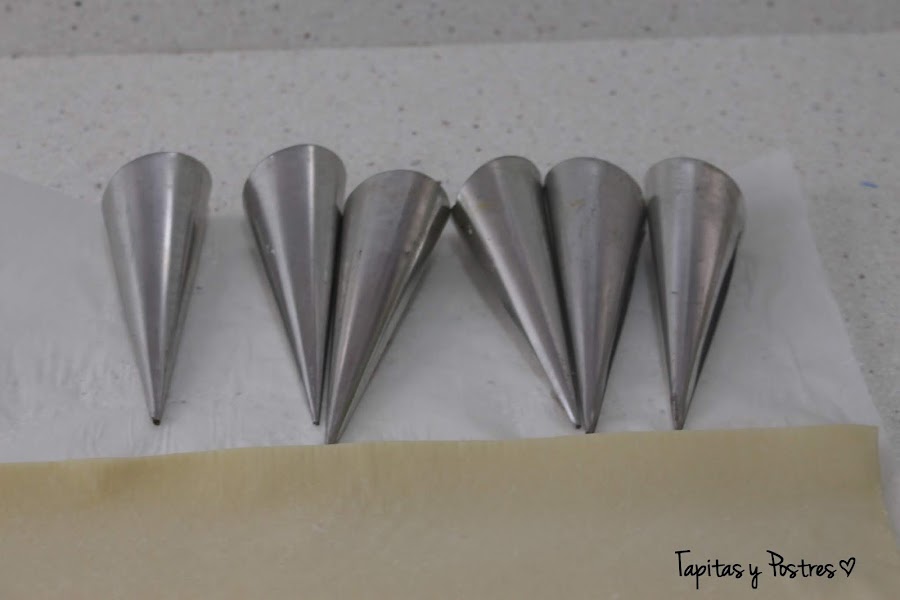 Y las enrollamos en los conos. Pintamos de huevo batido y al horno.