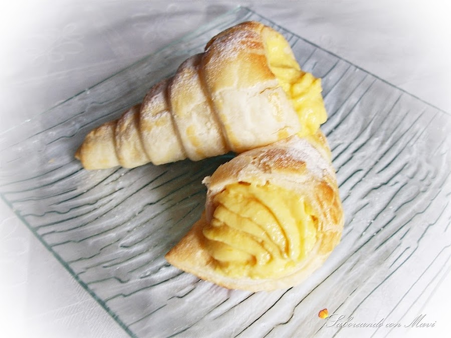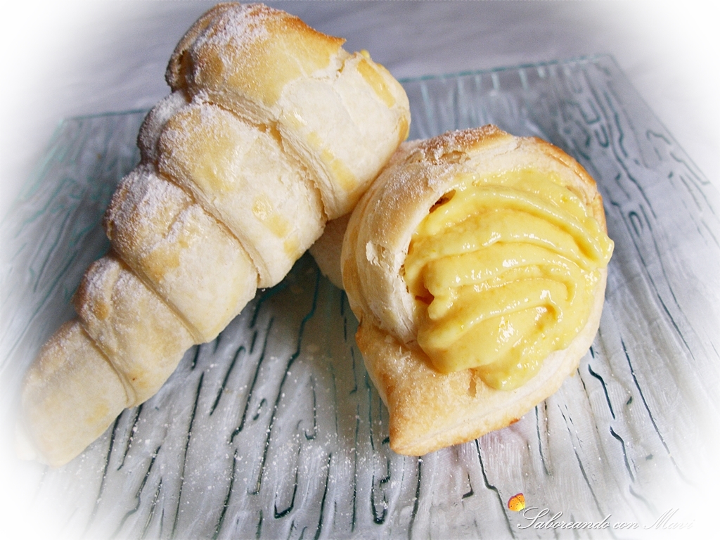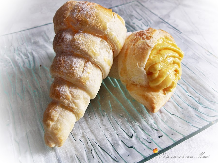 Estiramos un poco el hojaldre y lo cortamos a tiras de unos 2 cm. Engrasamos los cucuruchos y enrollamos el hojaldre. Cuidado, no enrollar hasta muy arriba que después no se quitan bien los moldes. Pintamos con un huevo batido y horneamos a 200º hasta que se doren.