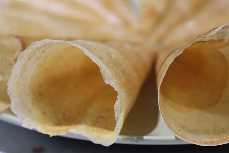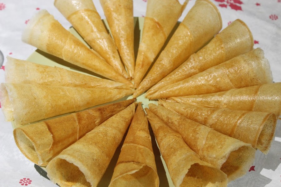 Mete la primera bandeja de cucuruchos en el horno, a 150º aproximadamente, durante unos 10 minutos. Cuando veas que han endurecido, la siguiente bandeja.
