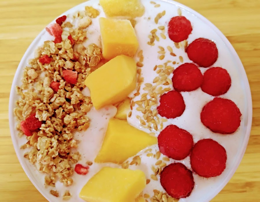 Decoramos la parte superior del cuenco con frambuesas, cuadraditos de mango, granola con fresas, el resto de las semillas de sésamo y... a disfrutar.