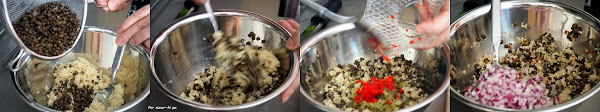 Poner las lentejas en una cazuela al fuego con agua abundante, una pizca de sal y un trozo de cebolla. Cocerlas durante 25 minutos aproximadamente, tienen que quedar enteras y un poco firmes. Retirar del fuego, escurrir y enfriar con agua, reservar.