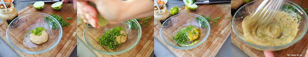 Colocar en un bol una cucharada de mostaza, una cucharadita de ralladura de piel de lima, una cucharada de hojas de menta fresca picadas, el zumo de la lima y tres o cuatro cucharadas de aceite de oliva. Emulsionar bien la mezcla, probar y rectificar de algún ingrediente si fuera necesario. Reservar.