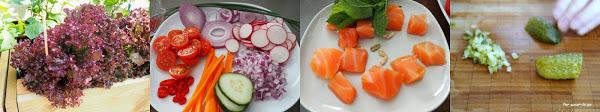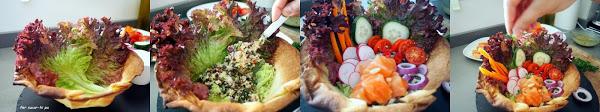Colocar tres o cuatro hojas de lechuga enteras en un lateral del cuenco de pizza. Añadir cuatro o cinco cuharadas de la mezcla de quinoa y lentejas. Repartir por encima la zanahoria, la cebolla, los tomates, el pepino, los rabanitos, alguna rodajita de chile y el salmón. Espolvorear con un poco de cebollino picado.