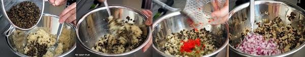 Colocar en un bol la quinoa y las lentejas y remover un poco. Añadir los pepinillos, el chile y la cebolla y mezclar. Aderezar con la vinagreta, dos o tres cucharadas (al gusto), e integrar bien con los ingredientes.