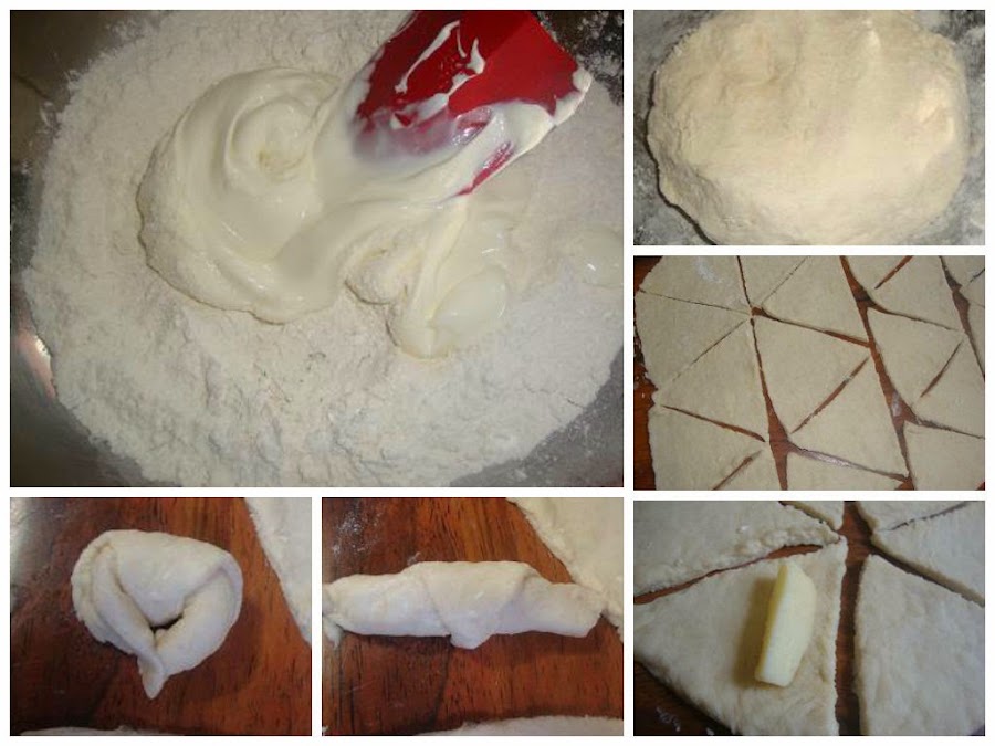 No existe una receta más sencilla para preparar una masa que te quedará suave y tersa, además de muy manejable y que al momento de cocinar, se esponjará y dorará de una manera hermosa, pues para realizar la masa lo único que hay que hacer es cernir los ingredientes secos y colocarlos en una fuente, agregar la crema de leche y combinarlos todos hasta que se forme una masa suave y tersa, si es necesario sólo hay que agregar el harina necesaria para que no se pegue en las manos, te recomiendo que la dejes reposar unos 20 minutos. Cuando obtienes una masa suave, que en verdad lo logras muy rápido, la extiendes sobre una mesa enharinada, cortas unas líneas de aproximadamente 7 centímetros de altura y después cortas unos triángulos en zig-zag, tal y como se muestra en la fotografía.
