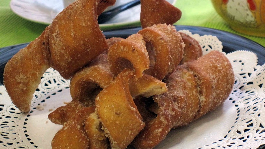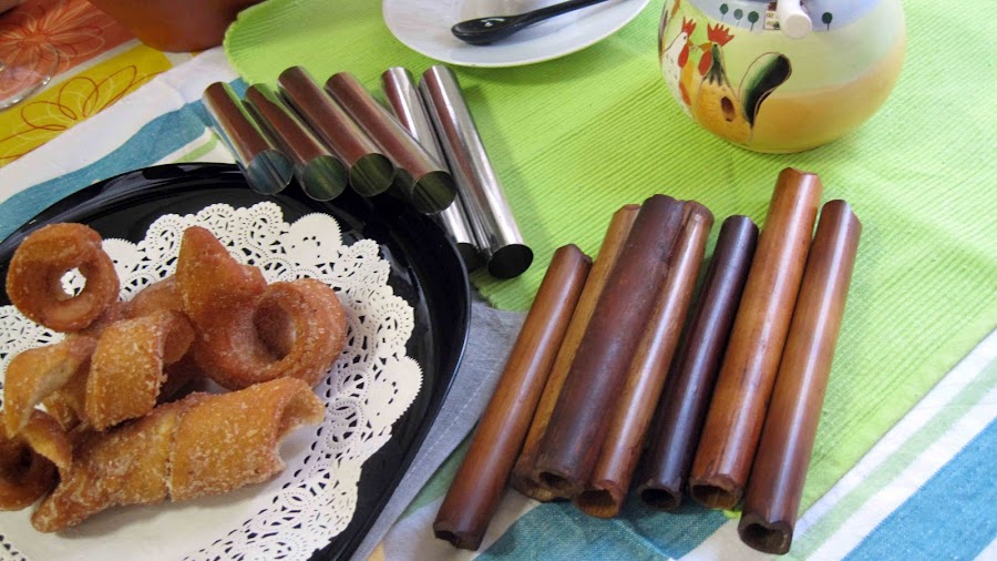 Esta labor se suele hacer entre dos, una persona va estirando la masa y poniéndola en los canutillos y la otra los fríe y los pasa por el azúcar.