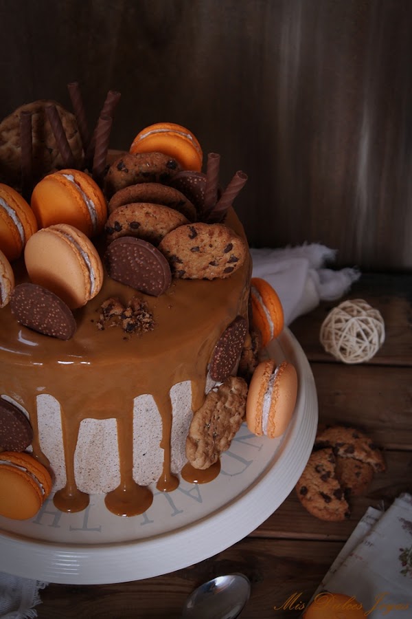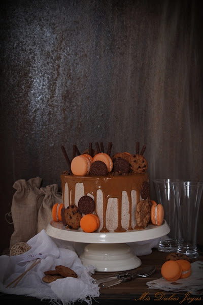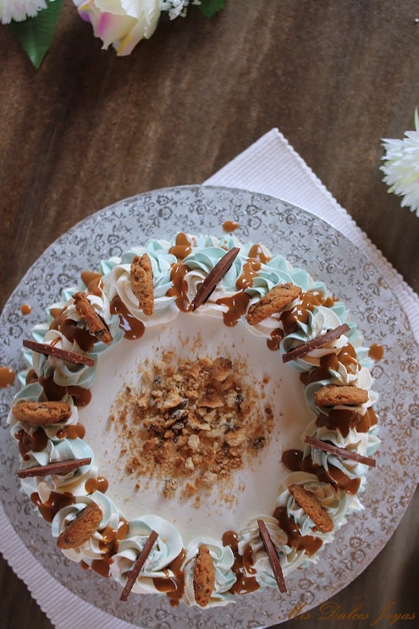 La tarta para el cumple de mi hija cada año tiene que ser diferente y sobre todo como a ella le guste. Después de debatir mucho sobre como le gustaría que fuese este año, teníamos claro que debía de ser elaborada con cookies y dulce de leche, y que el dulce de leche y las cookies se tenían que notar en la receta. Estos dos ingredientes no podían acompañar el resto de los ingredientes, sino dominar sobre ellos.