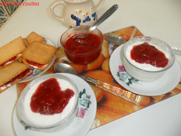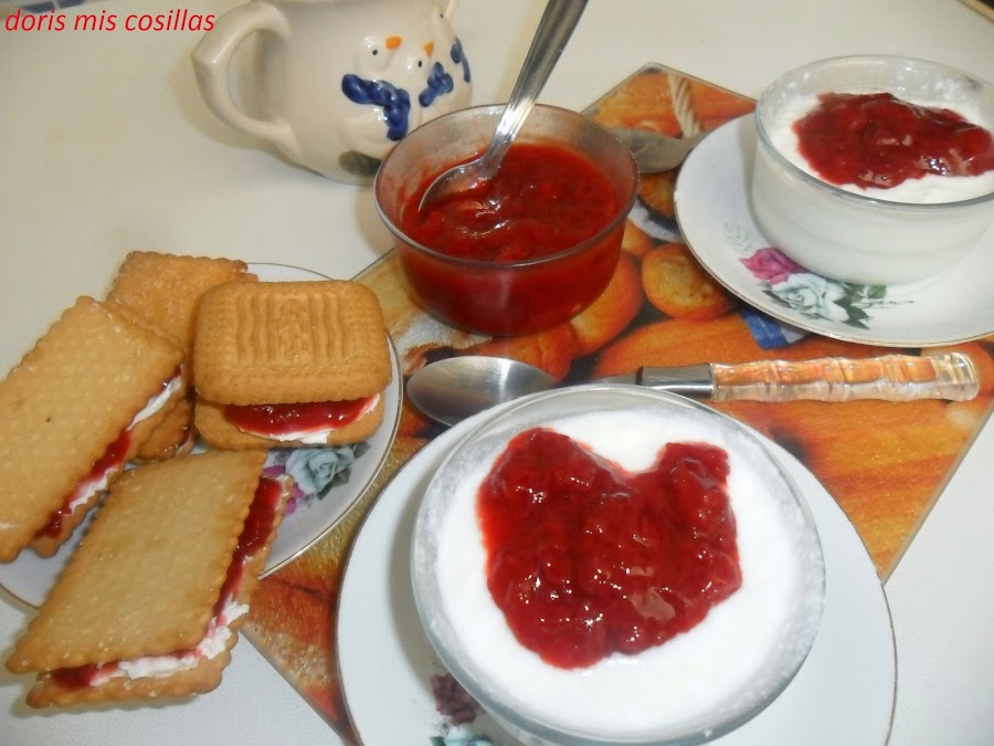 Este a sido el desayuno para hoy, compuesto de yogur con mermelada casera, galletas untadas con queso crema desnatado y mermelada de fresas recién preparada...un lujo al alcance de todas/os...!!!
