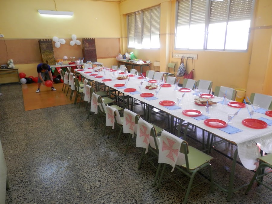 En la mesa donde se sentaban, con papel continuo hicimos unos cubre sillas con la decoración de caballeros, aunque no los pegamos y terminaron por los suelos.
