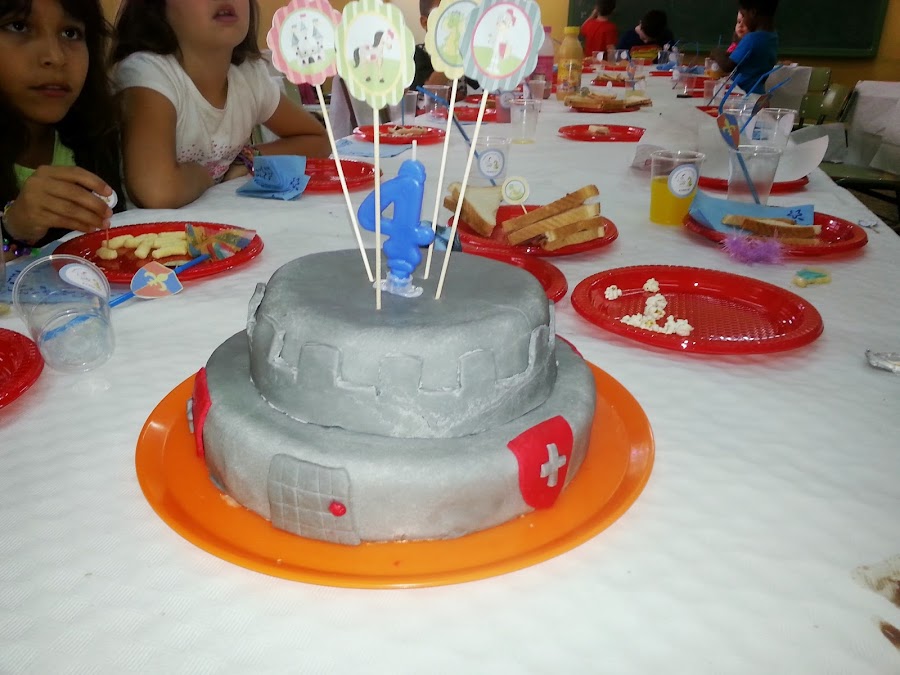 Y para fin de fiesta, la tarta. Esta vez me salió más comestible, la hice de bizcocho y fondant, se parecía a un castillo, pero como siempre, en mi imaginación quedan mejor que en la realidad. Para adornarla les puse unos dibujitos de caballeros pegados en palillos.
