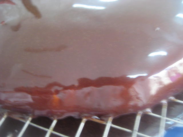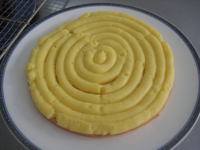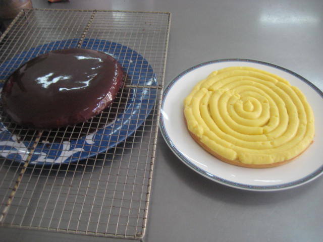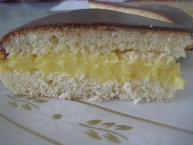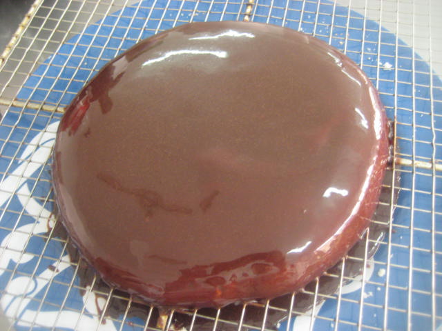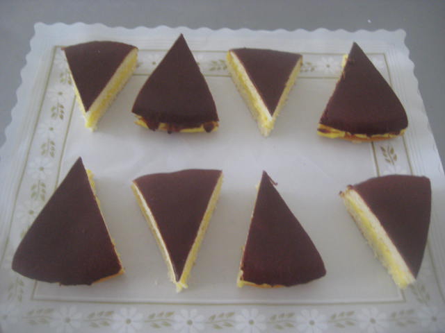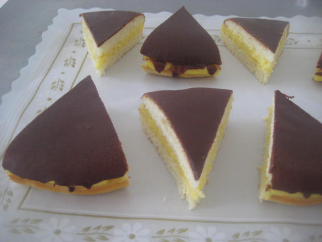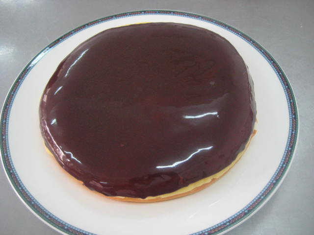 Montaje y glaseado Cuando las tortas estén frías abrir por la mitad, poner la crema pastelera en una manga y rellenar. Colocar encima la otra parte de la torta y dejar unos minutos en la nevera. Mientras tanto hacer el glaseado de chocolate y para ello, poner un cazo al fuego y calentar el azúcar con el agua. Cuando esté hecho un almíbar ligero, añadir la cobertura y batir enérgicamente con varillas. retirar del fuego, dejar que atempre un poco y bañar la torta colocada sobre una rejilla. Dejar que escurra y llevar a la nevera para que el glaseado solidifique. Una vez esté solidificado, partir la torta en 6 u 8 cuñas y si se desea untar los laterales con crema pastelera. Yo no lo he hecho.