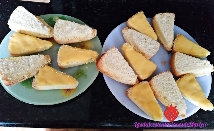 Ponemos las cuñas de bizcocho sobre una rejilla y las vamos bañando con el chocolate.