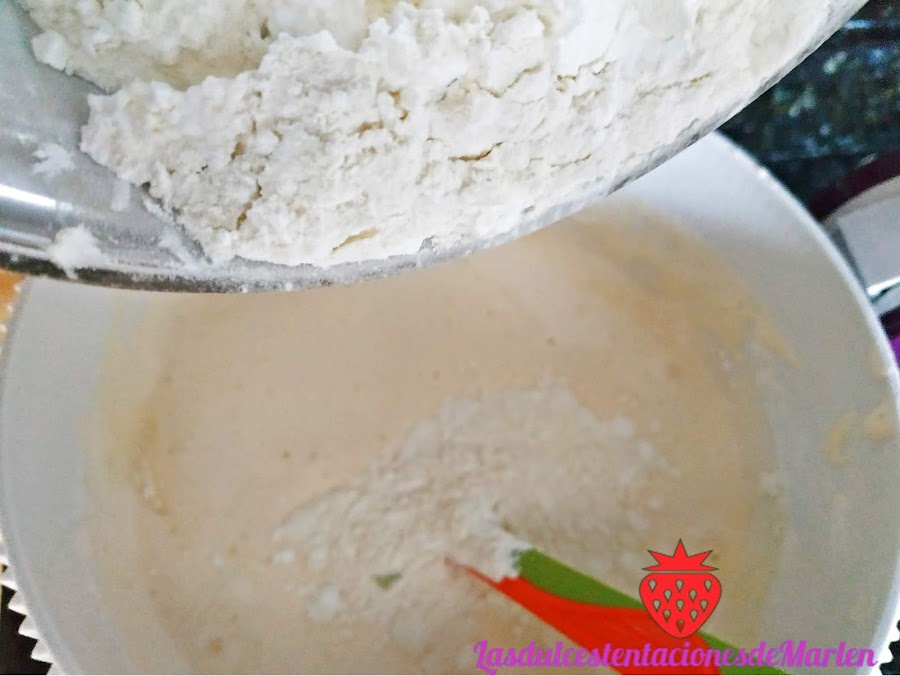 Agregamos las yemas y seguimos batiendo; añadimos el azúcar y seguimos mezclando. Añadimos la harina y la maicena, previamente tamizadas; mezclamos con movimientos envolvente, para que no pierda la cremosidad.