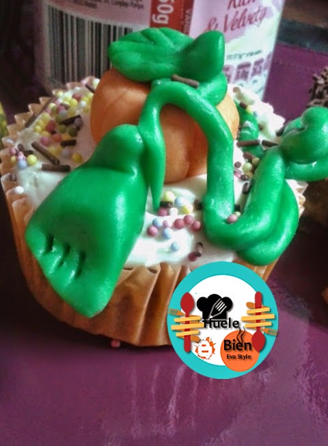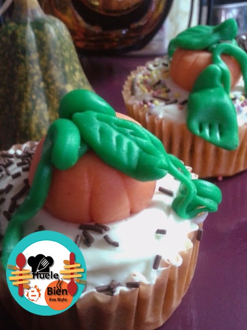 3.- Ponemos una calabaza en cada cup cake, decoramos con las hojas y tallos. Esparcimos sobre ellos algunos fideos de chocolate y algunas bolitas de azúcar.