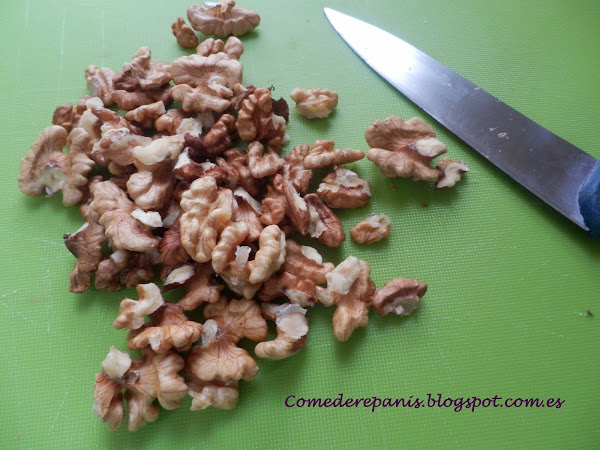 Corta en trozos las nueces, lo puedes hacer en una picadora pero ten mucho cuidado porque lo bueno es que se puedan notar al comer, yo las he cortado con un cuchillo para poder comer trozos de nueces al morder mis cupcakes.
