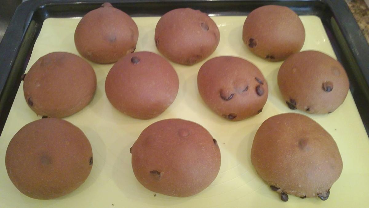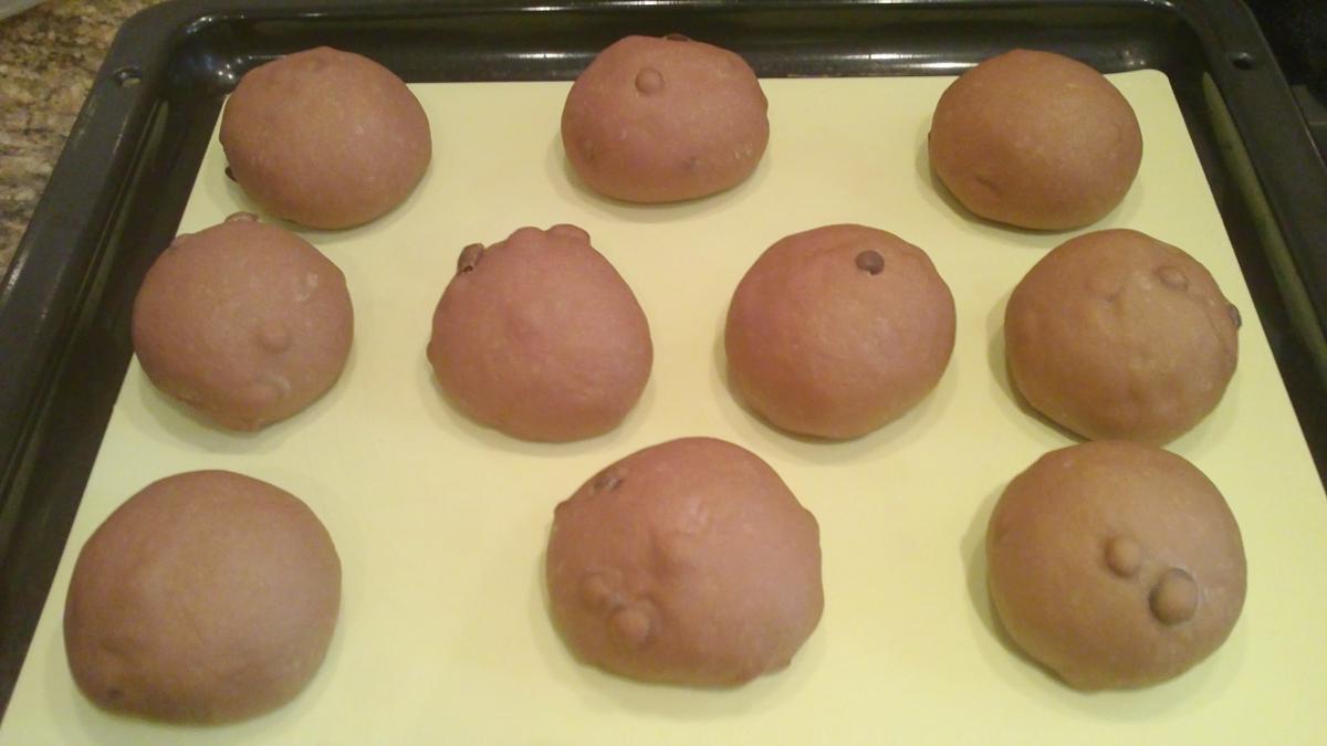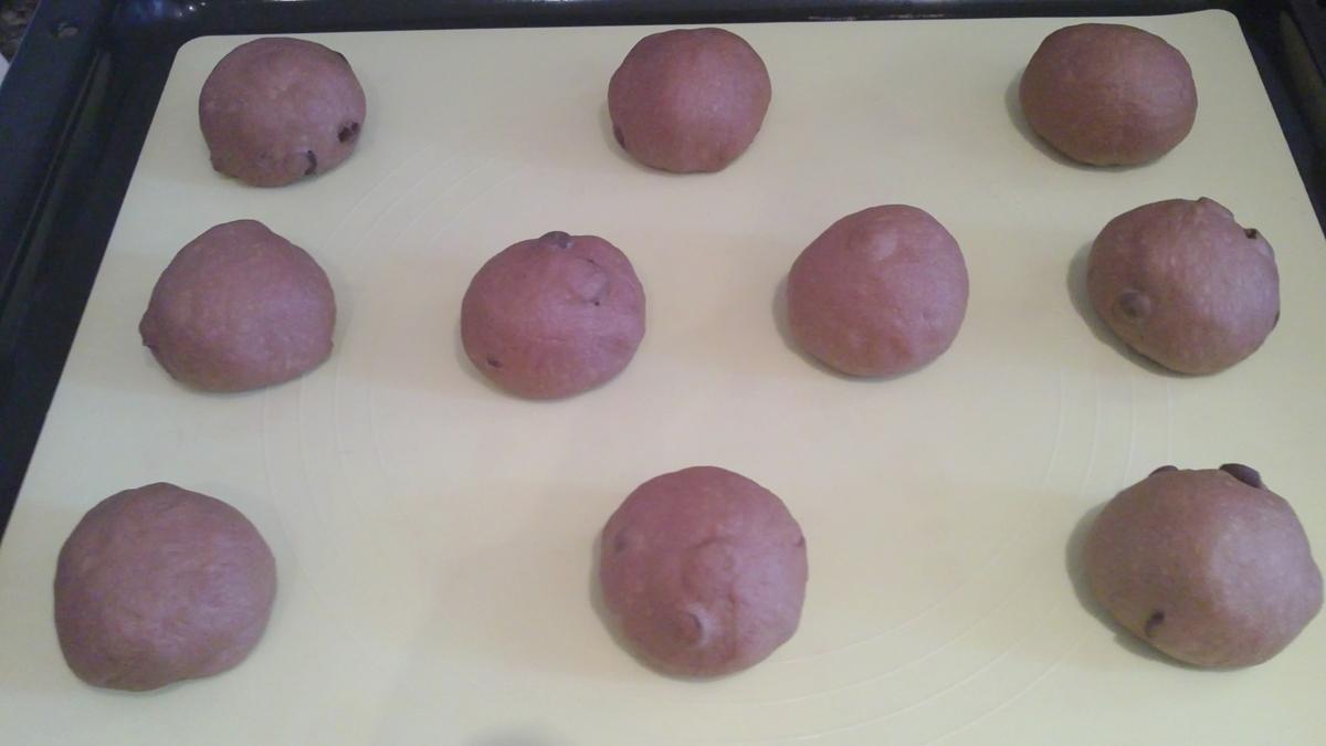 Boleamos cada bolita y ponemos en una bandeja de horno forrada de papel ó sil-pak, dejamos levar de nuevo unos 15 minutos: