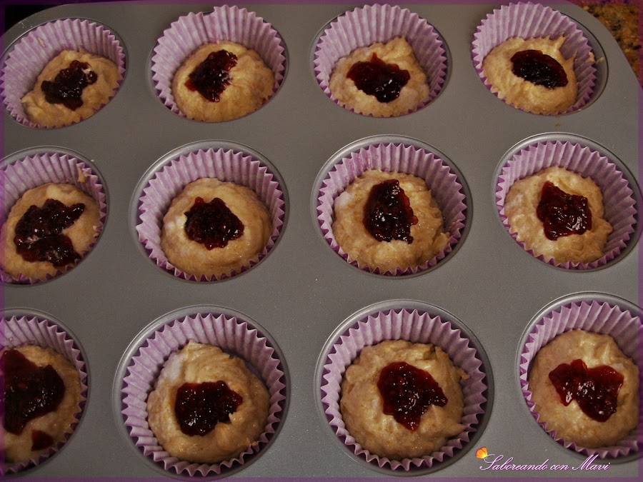 Repartir la masa en los moldes de papel cubriendo solo el culo. Poner en el centro de cada molde un poco de mermelada de frambuesa y cubrir hasta 2/3 del molde.
