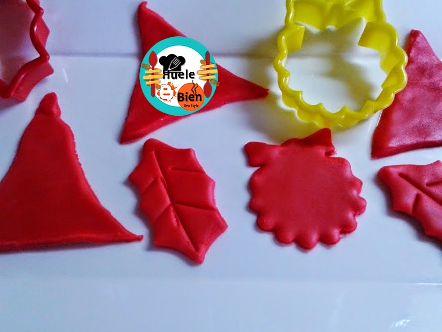 4.- Con unos moldes de motivos navideños cortamos la pasta fondant..(Primero tenemos que extender la pasta sobre una superficie con un poco de azúcar glas y un rodillo de silicona). Decoramos los cup cake y le añaimos las bolas de azúcar.