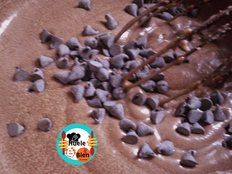 1.-Batimos la margarina con el azúcar. Añadimos los huevos de uno en uno sin dejar de batir. Mezclamos también la harina tamizada, el cacao en polvo y los chips de chocolate.