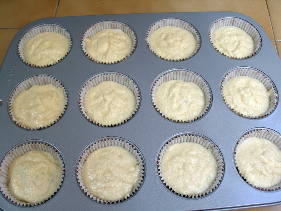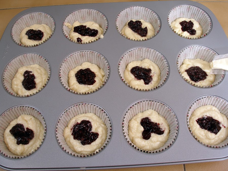 Repartir la masa en los moldes de papel cubriendo solo el culo. Poner en el centro de cada molde un poco de mermelada de frambuesa y cubrir hasta 2/3 del molde.