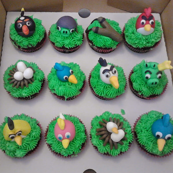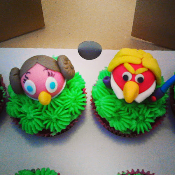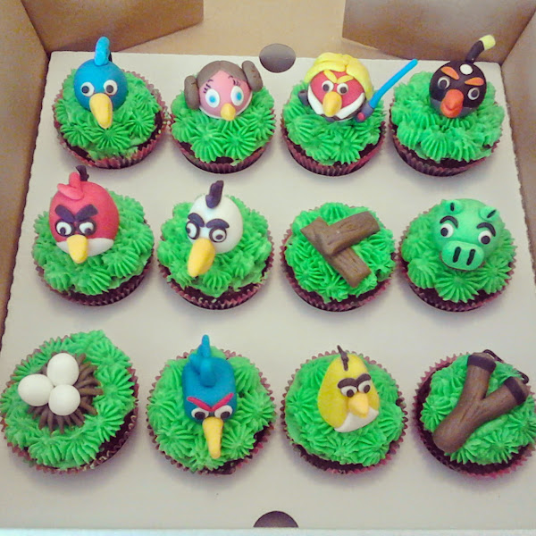 Hola, aqui os dejo unos cupcakes de angry birds que me encargaron para un cumple comunión. Si como hacia la comunión y estaba cerca su cumple lo quisieron celebrar todo en uno. Al cumpleañero le gustan mucho los angry birds asi que estos cupcakes no podian ser de otra cosa sino de los famosos pajaritos.