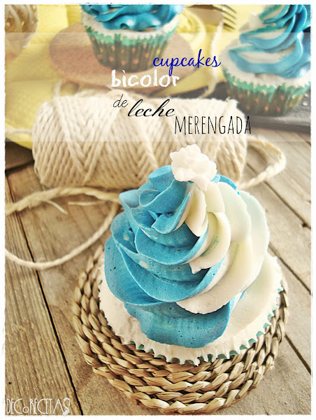 Para decorar teñiremos media parte de la buttercream que hemos obtenido con colorante al gusto, en mi caso azul, y disponemos cada color dentro de una manga pastelera diferente que a su vez meteremos dentro de otra más grande con la boquilla