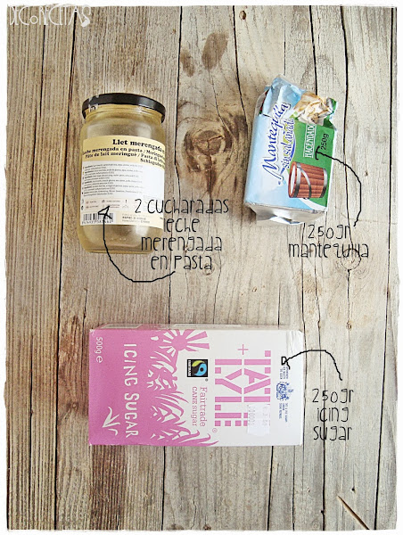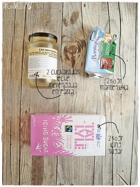 Para hacer la buttercream mezclamos el icin sugar junto con la mantequilla, la pasta de leche merengada y si fuera necesario añadiremos 2 cucharadas de leche. Batimos hasta que tenga aspecto de nata montada (crema de leche)