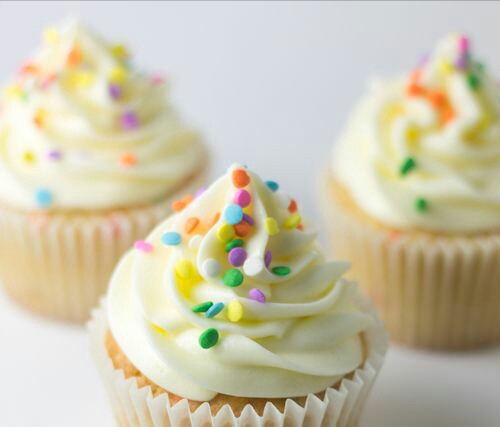 En la batidora coloque la mantequilla y azúcar creme 5min,luego agrege la vainilla y los huevos uno a uno bata 3min,aparte cernir harina,polvo de hornear,bicarbonato,sal,alterne los secos cernidos con la leche terminando con secos,vierta una cda de pasta en moldes de quequitos con capsulitas de papel hornee a 350grados f por 18min a 20min,ya listo los cupcakes y fríos decore con los lustres,merengue,confitillos,chantilly o al gusto.