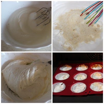 Añadimos la almendra molida con movimientos envolventes procurando que no se baje y rellenamos los moldes de cupcakes.