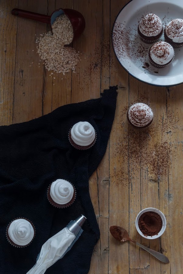 Y receta a receta hemos llegado a este 2017 y aquí van los primeros cupcakes del año: unos deliciosos cupcakes de avena y chocolate con un irresistible merengue francés.