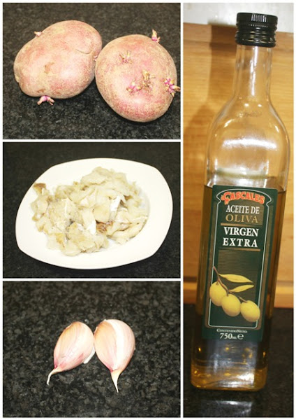 Partimos las patatas, y las ponemos a hervir con abundante agua, cuando veamos que las patatas están casi listas (al pinchar con un tenedor se parten fácilmente) añadiremos el bacalao y mantendremos al fuego hasta que el agua vuelva a hervir, momento en el que lo retiraremos del fuego y lo pondremos a escurrir.