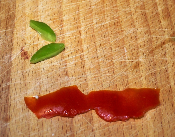 Para la decoración haremos una rosa con la piel del tomate, para ello pelamos un tomate finamente y enroscaremos la piel sobre sí misma, con el pimiento verde hacemos las hojas de la flor, colocaremos en la parte más alta del cupcake.