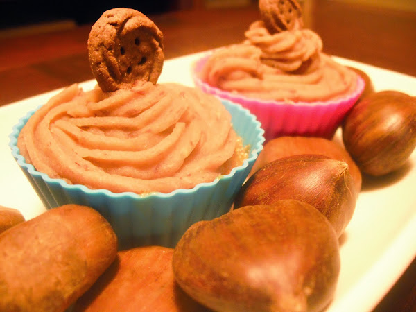 4. Con una espátula o un cuchillo plano ponemos un poco de crema de castañas sobre las cupcakes para dejarlas totalmente planas. Después la introducimos en una manga pastelera y decoramos las cupcakes con un movimiento circular y siempre de fuera hacia dentro. Decoramos con una galletita.