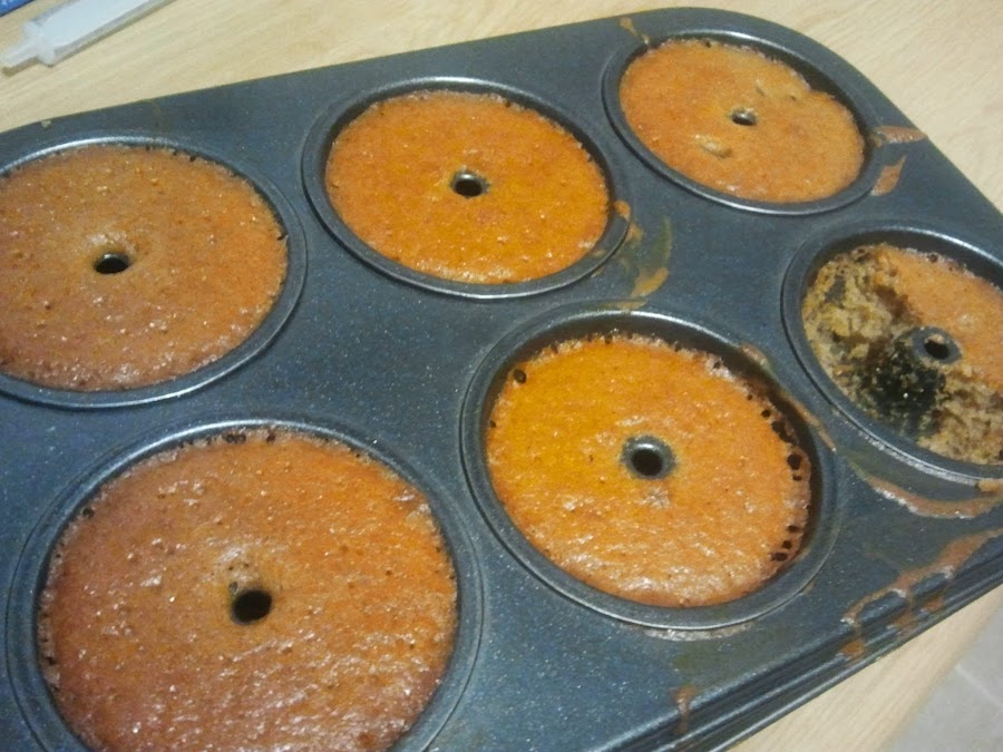 La idea inicial era hacer una especie de donuts con unos moldes que nunca había usado. El resultad fue el que podéis ver en la foto... no se despegaron. Ahora lo pienso y digo... lógico. Esos moldes no son para eso, ahora me tocará comérmelos con una cucharilla para desayunar. Así que al final me decidí por la solución más sencilla, cupcakes.