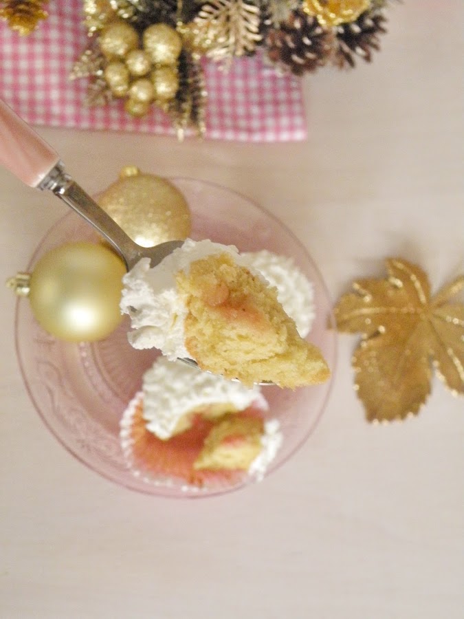 10. Para acabar, cuando los cupcakes estén bien fríos, utilizaremos un descorazonador de manzanas para rellenarlos. Lo introducimos en el centro del cupcake y sacaremos el interior; después, rellenamos con la mermelada y volvemos a poner la tapita de bizcocho que le habíamos quitado. Cuando estén todos rellenos, pondremos la nata (crema de leche) vegetal en una manga pastelera (yo he usado la boquilla 104 de wilton para hacer esa forma de flor) y decoraremos a nuestro gusto.