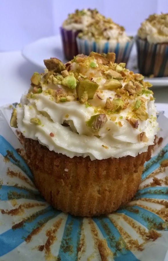 Para hacer la base utilicé la receta de los cupcakes de chocolate blanco de Alma Obregón, a la que le añadí media taza de pistachos molidos. En cuanto al frosting, utilice una receta básica que nunca falla y que me encanta, que no recuerdo de donde saqué. Pero he decir que me quedé con las ganas de hacer éste de chocolate blanco. No tenía suficiente chocolate. Pero algún día...