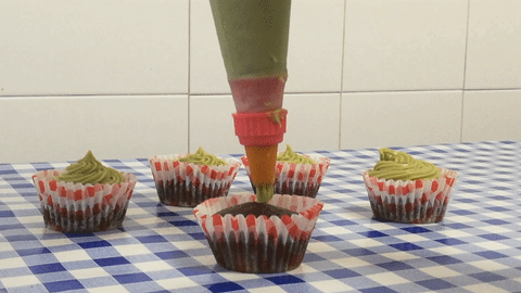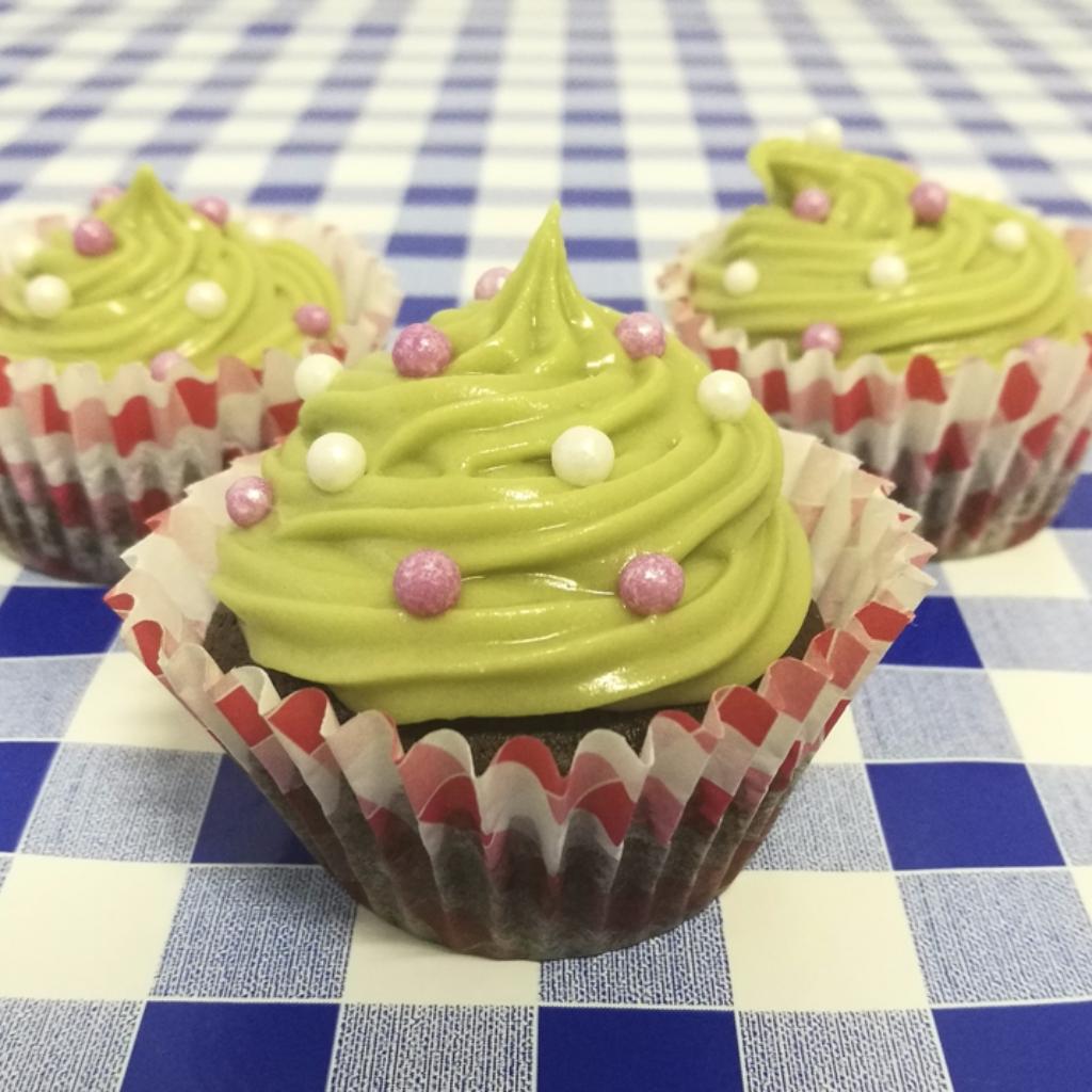 Metemos el glaseado en una manga pastelera y decoramos con la forma que queramos cada cupcake. Como el té Matcha le daba ese color verde decidí ponerle unas bolitas de colores por lo que parecían pequeños árboles de navidad y nos pueden servir para esas fiestas.