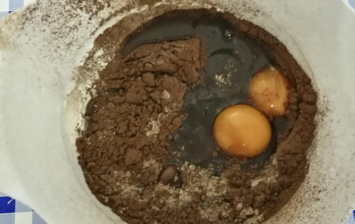 Cogemos un bol para preparar la masa de las magdalenas, pesamos la harina y la pasamos por un colador para tamizarla, pesamos el azúcar y lo echamos en el bol, a continuación hacemos lo mismo con el cacao y la levadura, mezclamos los ingredientes secos.