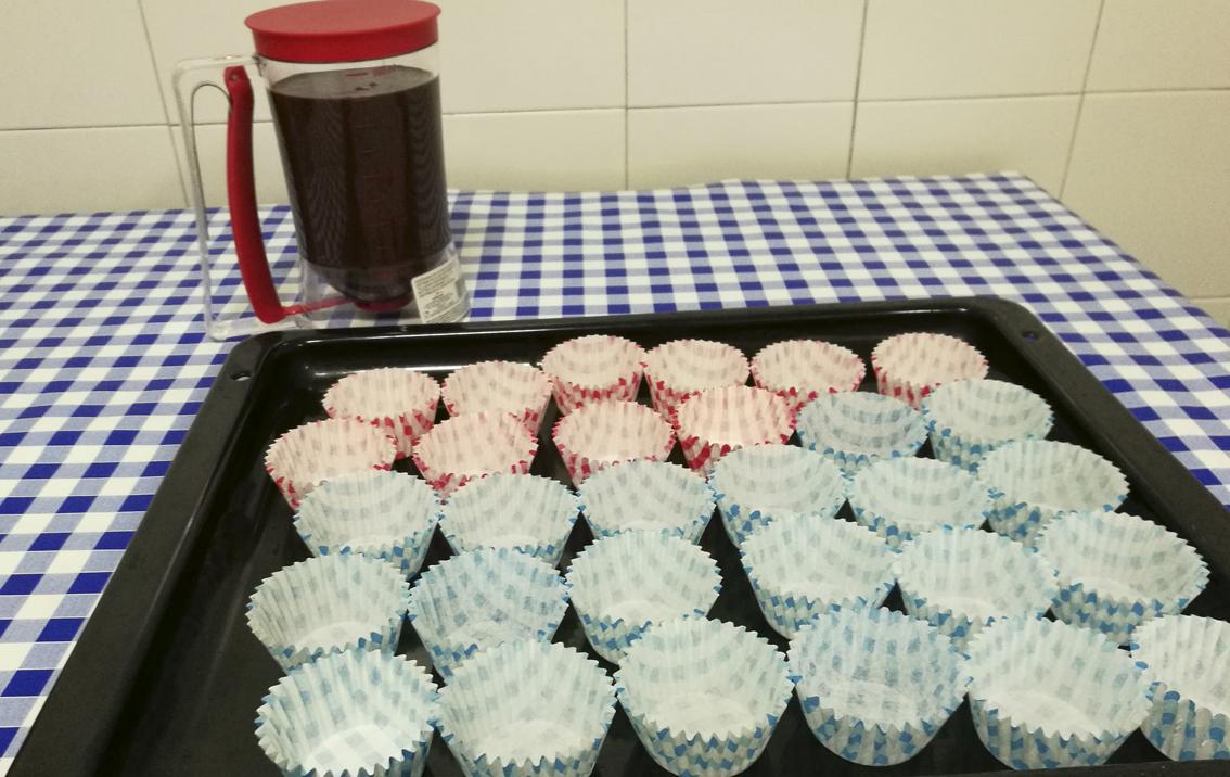 Ponemos a precalentar el horno a 180°C, mientras se va calentando vamos poniendo en la bandeja del horno los moldes extendidos de las magdalenas, para rellenarlos cuando tengamos lista la masa.