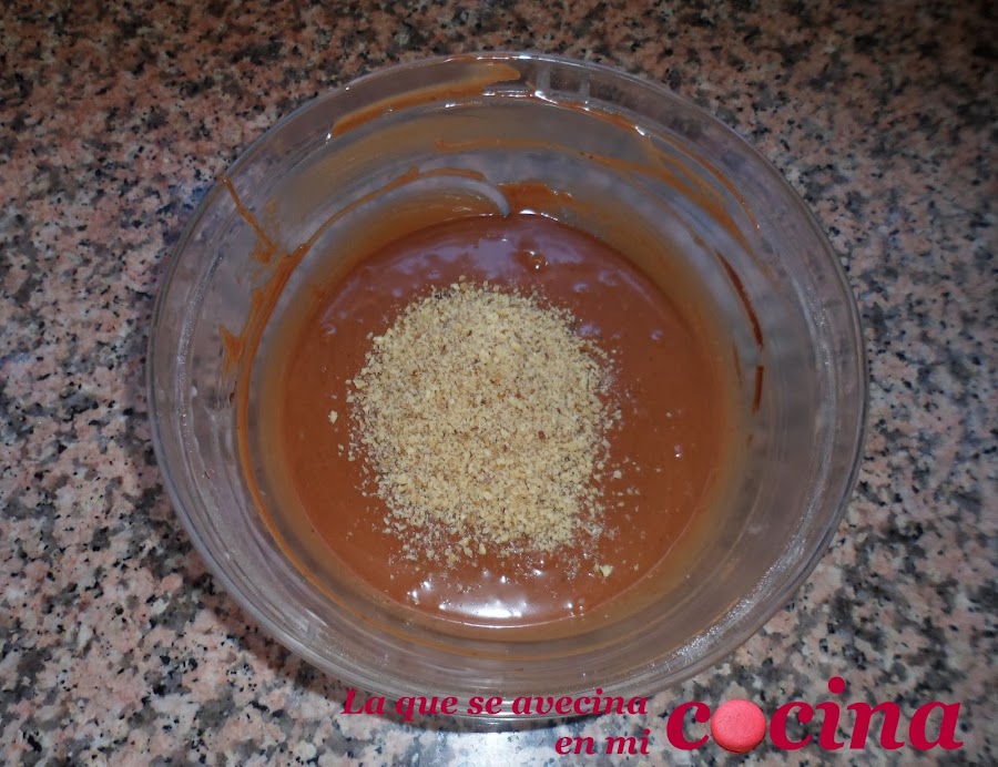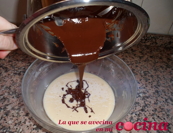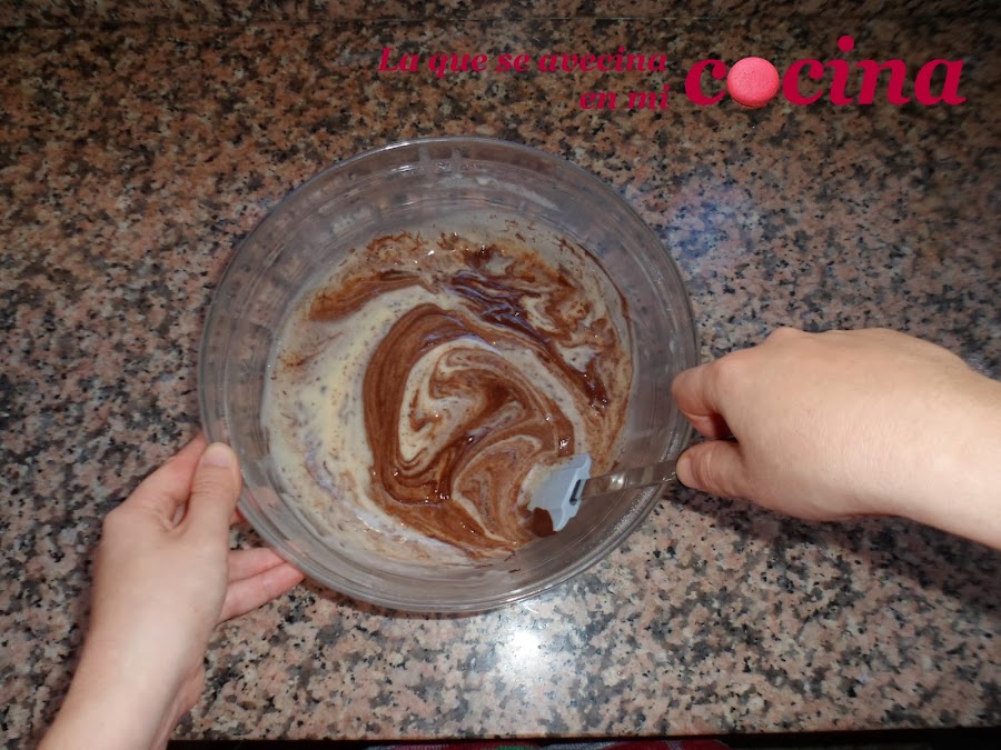 En el momento que todo esté integrado, volcaremos el chocolate fundido sobre la mezcla y seguimos removiendo para que el chocolate se reparta bien.