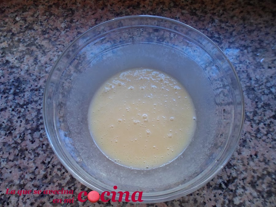 A continuación en un bol echamos el azúcar y el aceite. Y batimos con unas varillas eléctricas hasta que ambos ingredientes estén bien integrados.