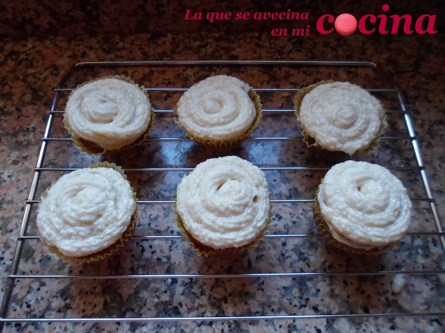 Por último (y sólo cuando se hayan enfriado completamente) sólo nos queda ponerles la buttercream por encima. Le ponemos una primera capa con un cuchillito o espátula pequeña para cubrir imperfecciones y luego es cuando comenzamos a echarle la crema con la manga pastelera. Como soy aún nueva en esto de los cupcakes usé una manga pastelera de silicona que tengo en casa, y por eso no puedo deciros que boquilla usé. Pero para que os hagáis una idea era como de estrella estriada.