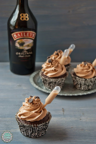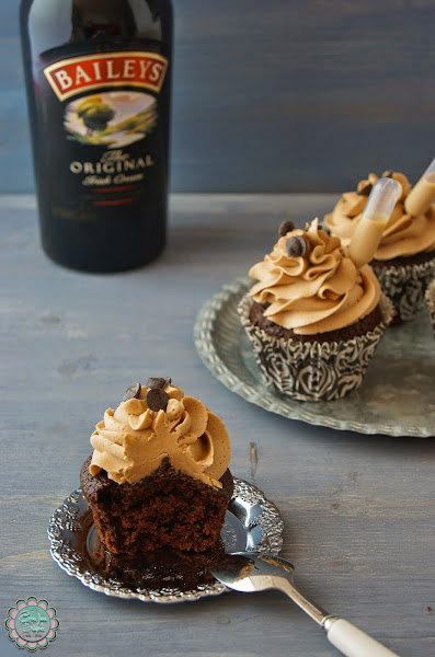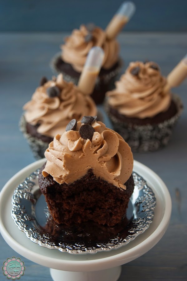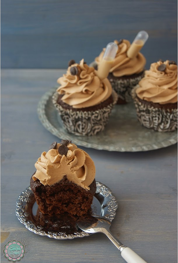 Estos cupcakes que os traigo son un capricho mío. Sí, tal cual, aunque sabéis que no soy nada chocolatera, hace unas semanas que les eché el ojillo por la red a unos que preparó Eva, de Con aroma de vainilla, y se me encendió la bombilla. Tenía por casa unas pipetas que había comprado y, al fin, ya sabía qué hacer con ellas. La excusa, me la sirvieron en bandeja: mi sobrino hacía 18 años y le preparábamos una fiesta sorpresa. A pesar de no tener demasiado tiempo, decidí prepararle la tarta, ni más ni menos que para 55 personas, todo un reto para mí. Le preparé una tarta personalizada de tres pisos, perdonad que no os ponga fotos pero no le hice fotos bonitas, solo una o dos con el móvil en las que no se aprecia apenas nada. Además preparé estos cupcakes, otros de chocolate y vainilla, aptos para menores y macarons de piña colada (otro de mis antojos, yo cocinaba, yo daba forma a mis caprichitos...). Tampoco tengo fotos de la mesa en la fiesta, pero sí de la receta de hoy.