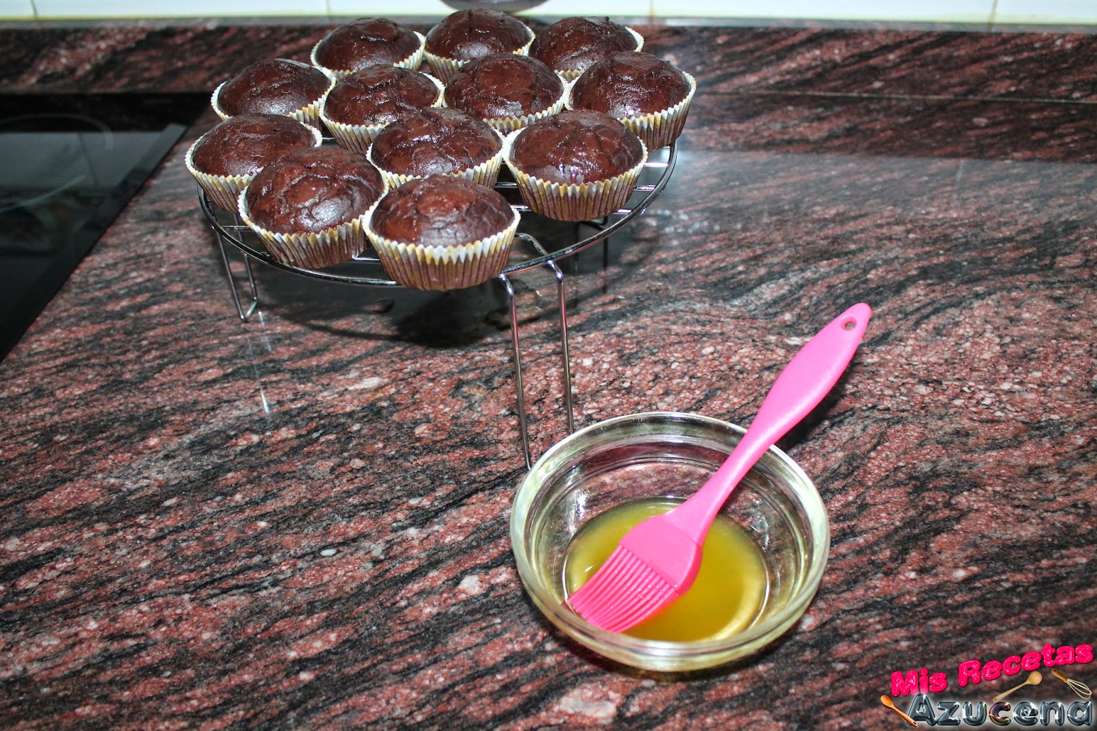 Una vez tengamos todos los cupcakes pinchados cogeremos y pincel y el almíbar que teníamos preparado y los pintaremos todos, tenemos que gastar todo el almíbar.