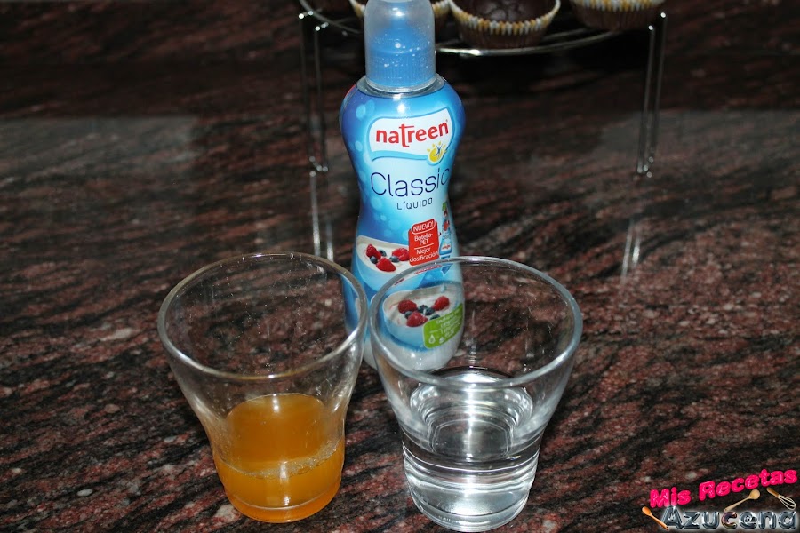 Ahora hacemos el almíbar, en un cazo ponemos el agua, el zumo de naranja y el edulcorante, lo mezclaremos bien y lo herviremos entre 5 y 8 minutos, apartaremos y reservaremos.