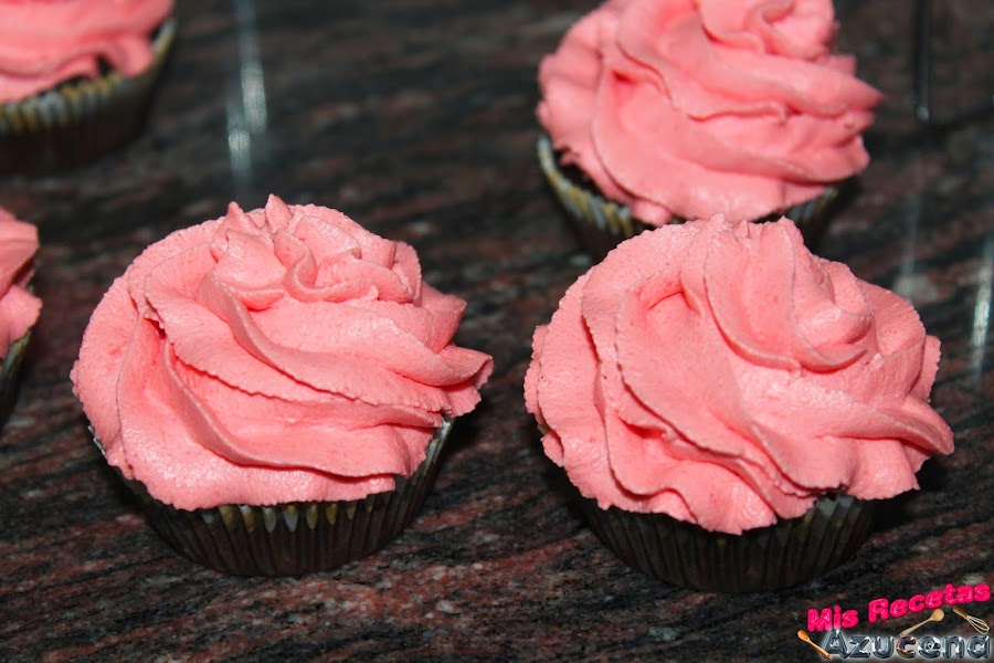 Ahora preparamos nuestra manga pastelera con una boquilla rizada, la rellenamos con la nata (crema de leche) para adornar nuestros cupcakes de fuera hacia adentro.