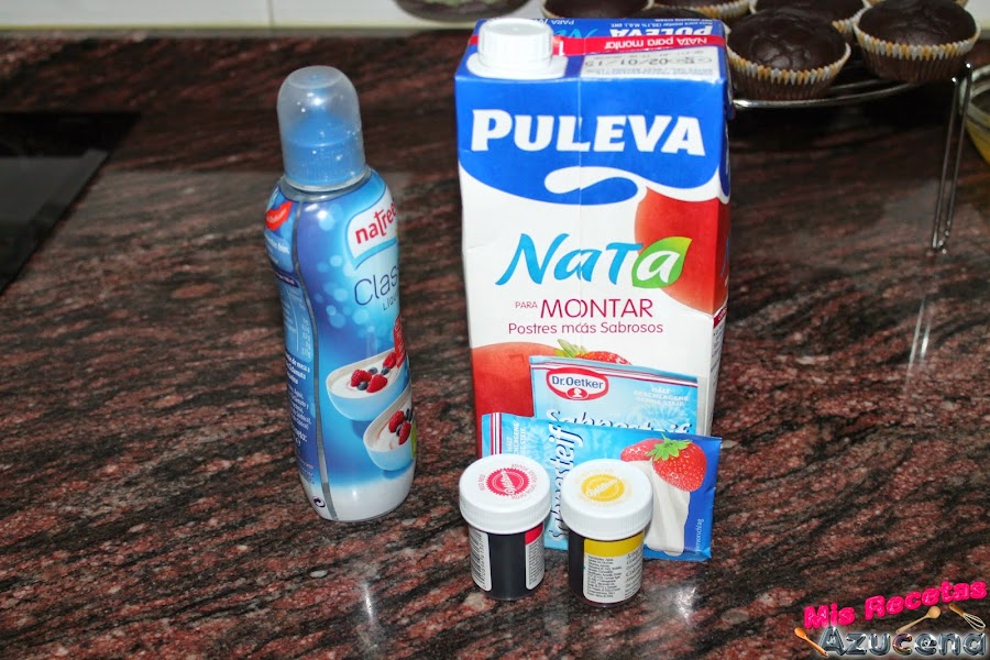 Le añadiremos los sobres de estabilizante y el edulcorante, empezaremos a montarla, a medio montar añadiremos el colorante.